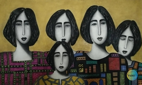 A warm, expressive portrait of a family of women clad in Egyptian-printed attire, set against a vibrant yellow background. The piece artfully blends figurative form with bold colour, offering both a celebration of identity.