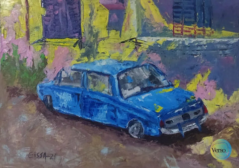 An oil painting by Amr depicting a Blue car on the street side of Egypt.