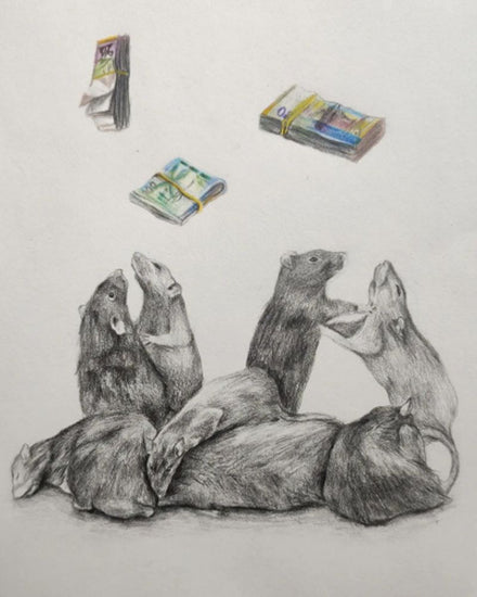 In this work, the rats, a reminder of greed, face each other in a large group fight for the Colombian banknotes that fall from the sky, like rain as an ironic figure. The criticism occurs when exploring the interior of the problems and daily experiences... Read More