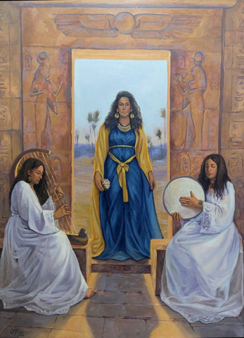 Description: The painting depicts an Egyptian Queen in a blue robe. You can also see Egyptian motifs and script on the walls of the building behind the women in the painting. Read More