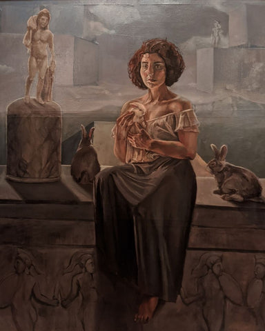 Description: A Syncretism artwork, inspired by the surrealism of Rene Magritte mixed with some neo-classical motifs found in John William Godward's work, represented in a contemporary manner. Read More