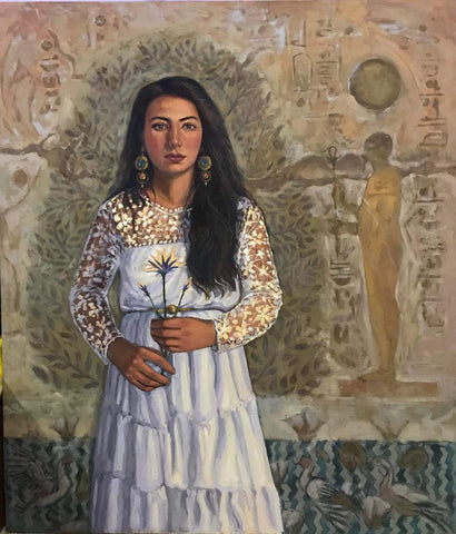 Description: Felopater paints a realistic Egyptian women in white. The background depicts a tree showing life and Egyptian script beautifully painted. Read More