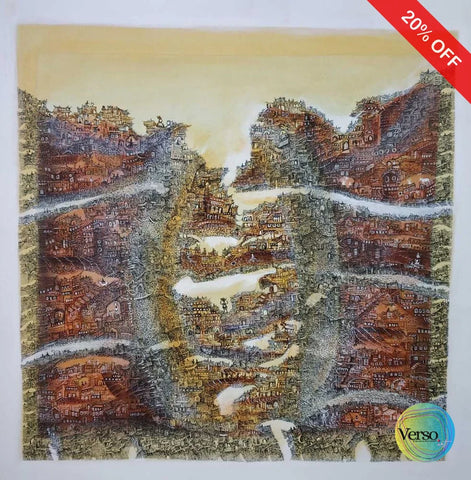 Nour paints a blue scene from the streets of Egypt where a female shepherd is with her sheeps. In the background you can see the Egyptian symbols and motifs in a beautiful pattern. The Blue painting stands out among all.