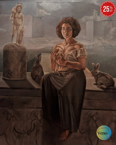 A Syncretism artwork, inspired by the surrealism of Rene Magritte mixed with some neo-classical motifs found in John William Godward's work, represented in a contemporary manner.