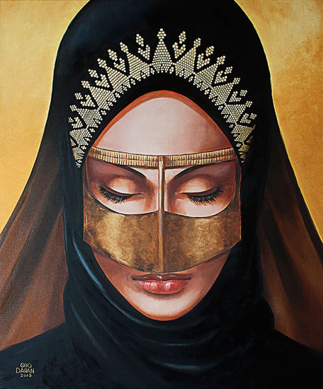 A captivating portrait of a Qatari woman draped in black against a radiant gold background, **Nagda** embodies elegance, strength, and cultural pride through bold contrast and refined, expressive brushwork.