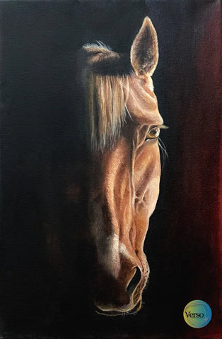 The painting is the face of a horse in the dark. It concentrates more on the light and shadow of the painting, retaining the focus on its sharp eye and detailing.