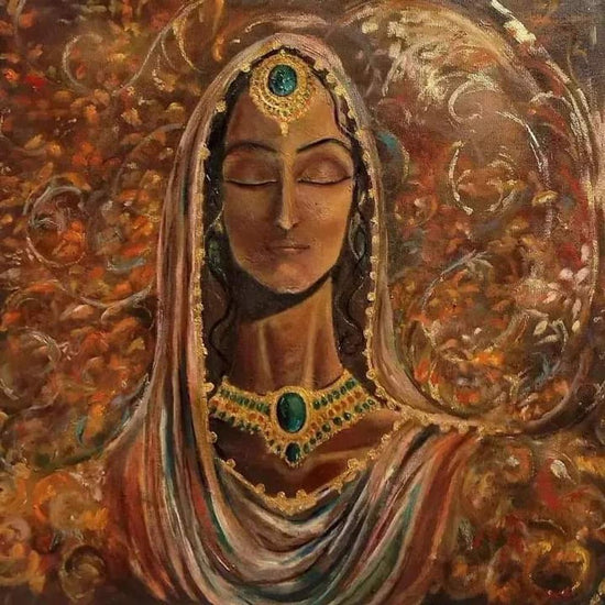 This warm toned oil painting depicts a head covered women wearing precious jewellery. She is concealed with her eyes closed.