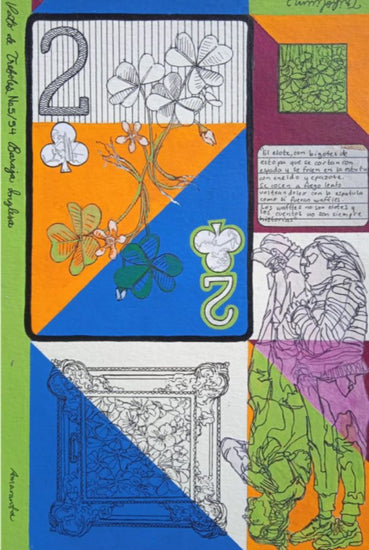 Or "Pato de tréboles" it's part of a series of paintings inspired in the English deck of cards, reinventing each naipe. This piece tells a story of cloud watching and infinite fields of clovers. As well this painting has four ways of orientation when hanging... Read More