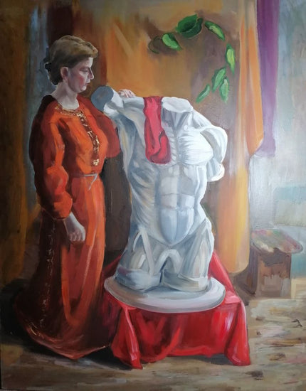 A realistic oil painting depicting a model leaning on the sculpture while resting and admiring the work of art.
