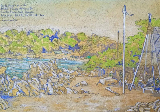 Live painting as a traveling artist at the beautiful beach of Manzanillo, at Puerto Escondido city in Oaxaca, México. This piece features a beach bar called La Isla.