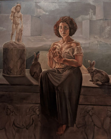 A Syncretism artwork, inspired by the surrealism of Rene Magritte mixed with some neo-classical motifs found in John William Godward's work, represented in a contemporary manner.