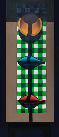 The artists beautifully paints with oil on canvas, a feast on a check pattern platter with a bowl in the corner.