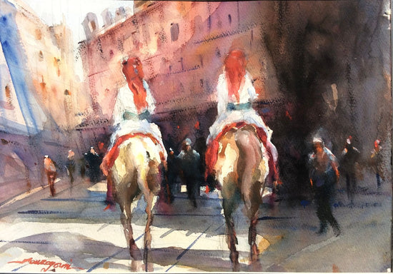 Elmuiz paints a scene with watercolor from the city of Souqwaqif with two horsemen.
